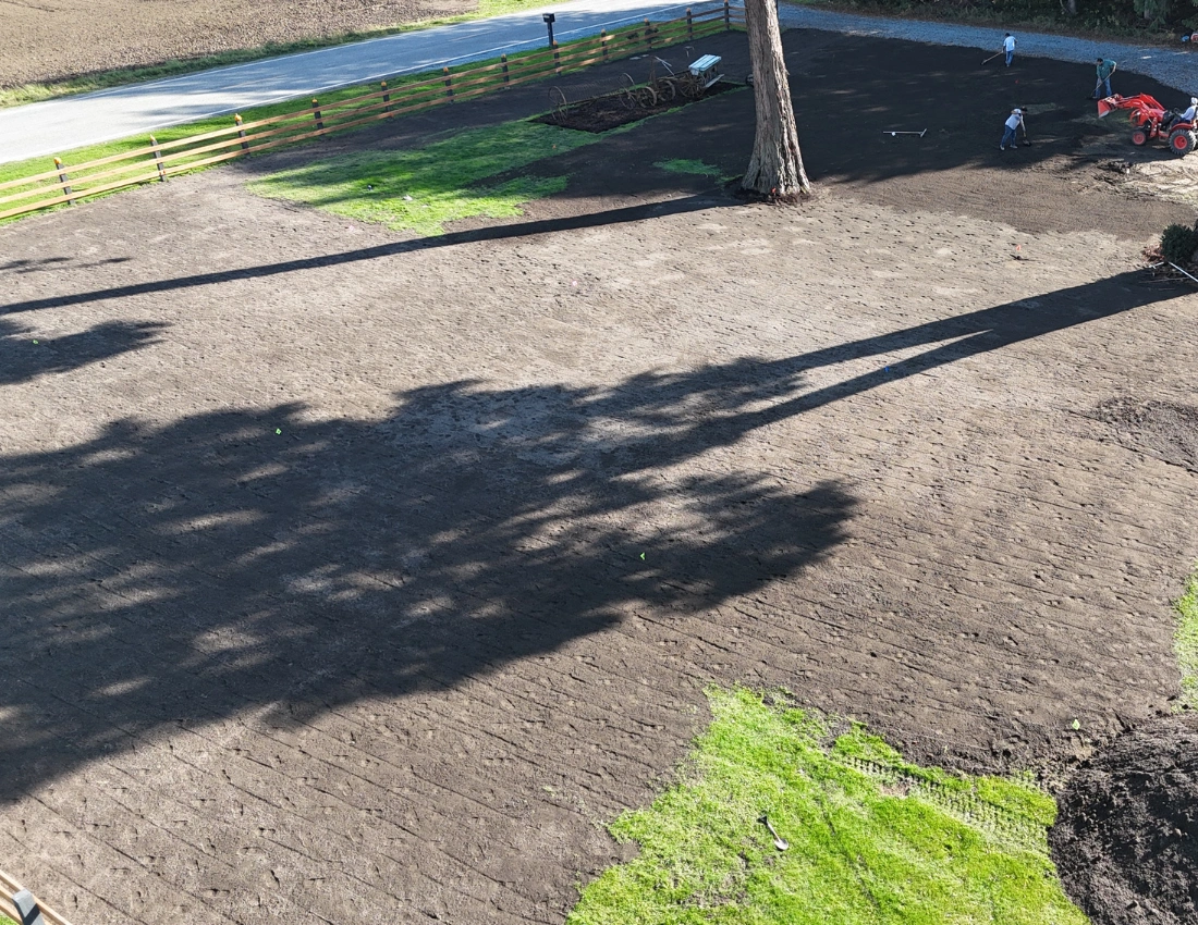 Once irrigation was in place, we shifted into the rejuvenation phase. Our team hauled in premium soil sourced locally from our partners at Lefebure Turf Farm, using it to regrade and level the lawn for improved drainage and a smooth, even surface.