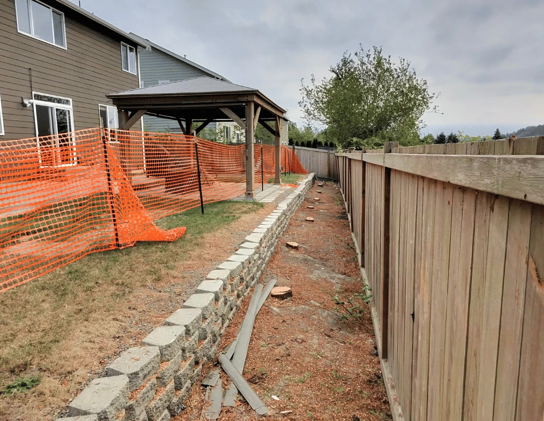 Our clients had recently moved into their new home and were met with two major challenges in the backyard: a failed retaining wall and an in-ground trampoline that left a large void in the center of the lawn. These issues affected the yard’s safety, functionality, and overall appearance.